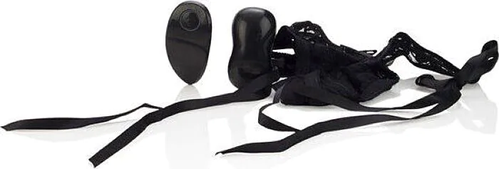 Schwarzer Spitzen-Tanga mit abnehmbarer Vibrationskugel von CALEXOTICS: kompakt, wasserdicht und mit 10 Vibrationsprogrammen. Für dich, wenn du diskretes, tragbares Lustspielzeug suchst, das sich leicht bedienen und reinigen lässt. Nicht geeignet, wenn du auf sehr starke, wiederaufladbare Motoren setzt.