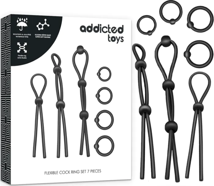 Erlebe intensivere Orgasmen mit dem 7-teiligen Set aus flexiblen Silikonringen von ADDICTED TOYS. Diese Ringe helfen, die Ejakulation zu verzögern und die Erektion länger aufrechtzuerhalten. Hergestellt aus hautfreundlicher, medizinischer Silikon, sind sie sowohl weich als auch hygienisch.