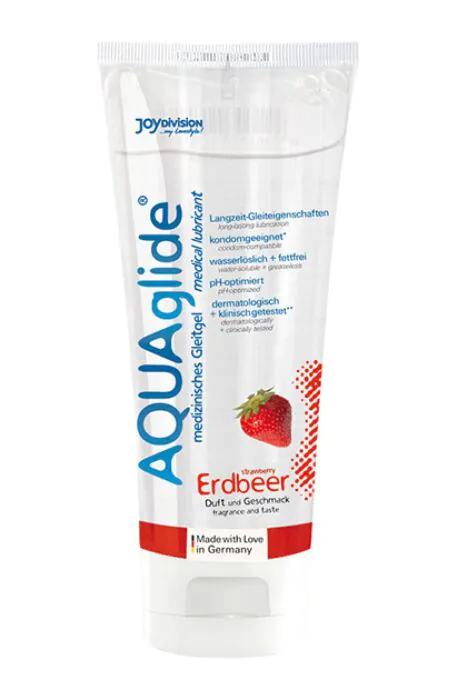 Wasserbasiertes Erdbeer-Gleitgel von JOYDIVISION AQUAGLIDE in 100 ml: dermatologisch geprüft, kondomsicher und lang anhaltend. Angenehmer Geschmack und nicht fettend — gut für Zweisamkeit und den Einsatz mit Sexspielzeug. Für alle, die ein verlässliches, leicht abwaschbares Gleitgel suchen, das sich auch für oral angenehmer gestaltet.