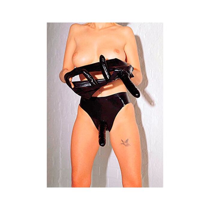 Fantastische Gurtzeug für Frauen mit Triple - Penis Latex in der Farbe schwarz, repräsentative Sammlung SHARON SLOANE Latex Collection.