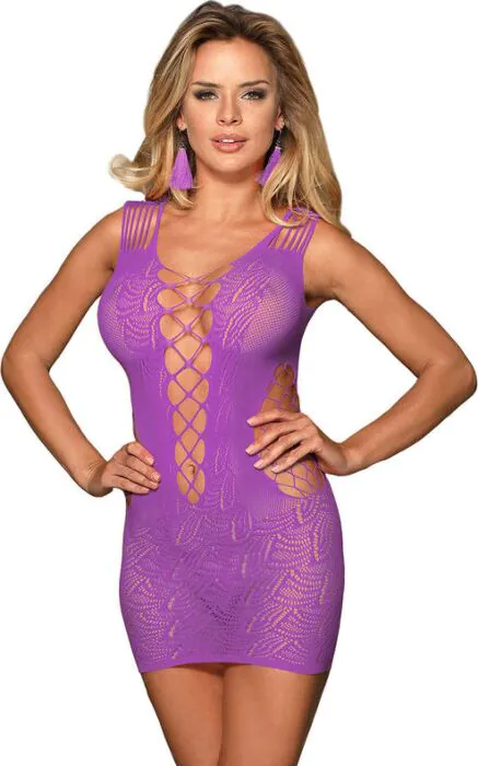 Ein kurzes Netz-Kleid in lila, das Eleganz und Sinnlichkeit vereint. Die Kombination aus 88% Nylon und 12% Spandex sorgt für eine bequeme Passform, während die kreuzdetails für einen auffälligen Akzent sorgen.