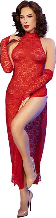 Leichtes, florales Spitzenmaterial, das sich sanft an deinen Körper schmiegt und die Kurven betont. Das Design mit schulterfreien Ärmeln und offenem Rücken sorgt für einen verführerischen Auftritt. Die mitgelieferten Handschuhe aus Spitze runden das Gesamtbild stilvoll ab.