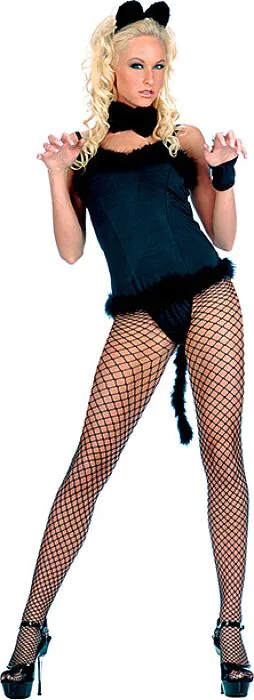Figurbetontes Katzenkostüm von Music Legs in Größe S/M — schlichtes, schwarzes Design für private Rollenspiele oder Karneval. Leicht zu kombinieren mit Strümpfen und Accessoires aus unserem Erotikshop. Für dich, wenn du eine unkomplizierte Verkleidung suchst, die schnell einsatzbereit ist.