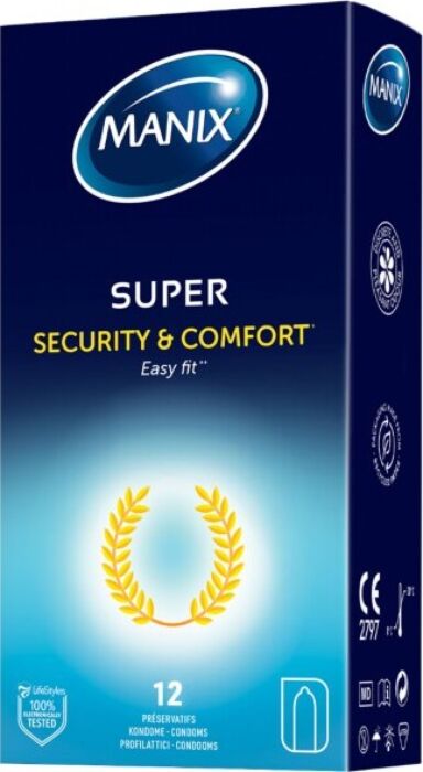 Manix Super sind klassische, geschmierte Kondome aus Naturlatex in Standardgröße (52 mm Nominalbreite). Ein praktisches 12er-Set für alle, die verlässlichen Sitz und einfache Handhabung wollen. Gut geeignet für Nutzer ohne Latexallergie, die ein transparentes, zylindrisches Kondom mit Reservoir bevorzugen. Ein solides Basismodell im Erotikshop für den Alltag.