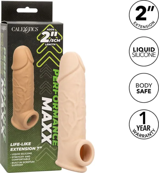 Die Performance Maxx 7 Hülle von CALEXOTICS bietet eine realistische Erweiterung um 5 cm für intensiveren Genuss. Indicado für Paare, die das Erlebnis verbessern möchten.