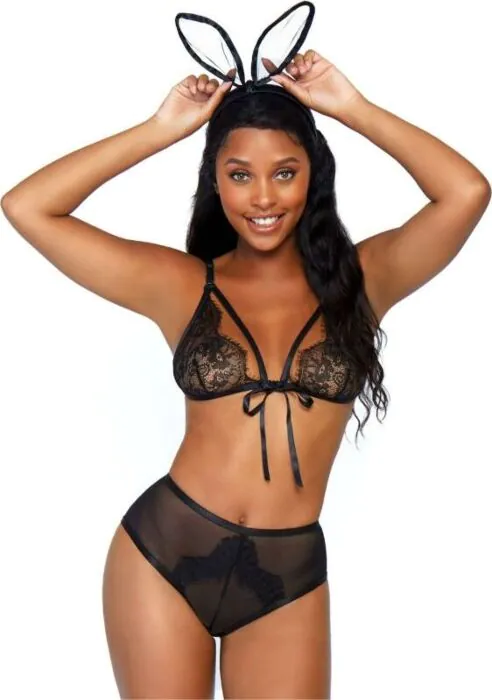 Das Bedroom Bunny Set von Leg Avenue ist ein schlichtes, verführerisches Kostüm für Rollenspiel und Dessous-Gelegenheiten. Du bekommst einen Spitzen-BH mit schlanken Trägern, ein freches Höschen mit Öffnung im Rücken samt flauschigem Schwänzchen und ein Ohren-Stirnband. Das Set ist leicht, klar auf Optik und Spaß ausgelegt und verzichtet auf Unterbrustbügel oder strukturierte Polster — ideal, wenn du es eher weich und unkompliziert magst.