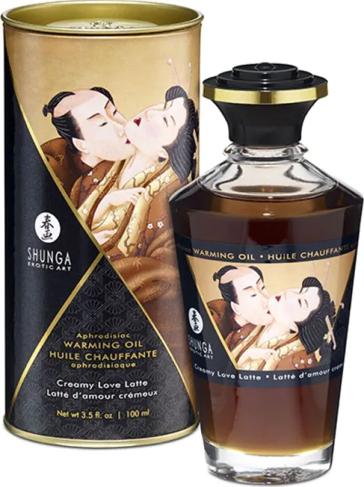 Sinnliches Massageöl von SHUNGA mit cremigem 'Creamy love latte'-Geschmack und wärmendem Effekt. 100 ml Flasche, entwickelt für erotische Massagen und Zärtlichkeiten zu zweit. Gut geeignet für Paare, die Geschmack und zusätzliche Stimulation durch Wärme suchen; nicht kompatibel mit Latexkondomen.