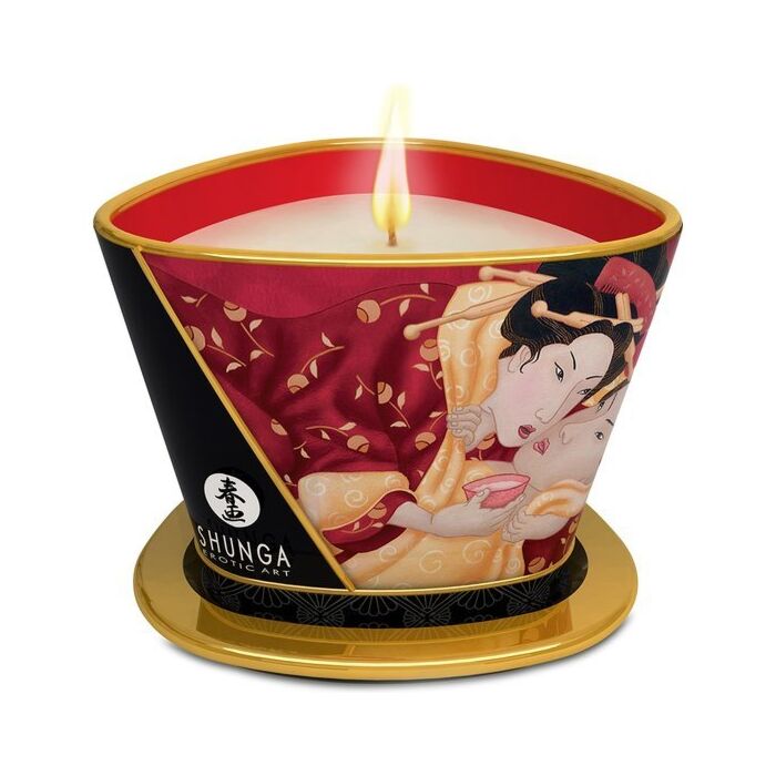 Entfachen Sie das Feuer der Leidenschaft mit der Shunga Massagekerze in Erdbeerduft! Stellen Sie sich eine intime und sinnliche Atmosphäre vor, in der der süße Duft von Erdbeeren und Sekt Ihre Sinne weckt. Mit 170 ml reinem Vergnügen wird Sie diese Massagekerze in ein einzigartiges Erlebnis aus Sanftheit und Sinnlichkeit hüllen. Entdecken Sie die erotische Welt von Shunga, in der jedes Produkt eine Einladung zum sinnlichen Genuss ist. Lassen Sie sich von den natürlichen Inhaltsstoffen in ein Universum der Sinnlichkeit und Erotik entführen. Verwandeln Sie Ihre intimen Momente in ein Kunstwerk mit der Shunga Massagekerze. Wie wird sie verwendet? Zünden Sie den Docht an, lassen Sie die Kerze eine warme Atmosphäre schaffen und gießen Sie das warme Öl auf die Haut Ihres Partners. Genießen Sie eine sinnliche Massage, die alle Sinne weckt. Trauen Sie sich, mit der Shunga Massagekerze in Erdbeerduft neue Empfindungen zu erkunden. Das Vergnügen liegt in Ihren Händen!