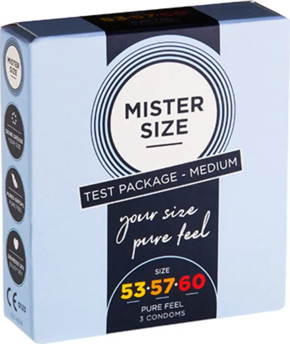 Drei aufeinanderfolgende Kondomgrößen (53, 57, 60) in einem Paket, gefertigt aus natürlichem Latex und fein geschmiert. Perfekt, wenn du unsicher über deine optimale Breite bist und verschiedene Passformen testen möchtest. Transparent mit Reservoir und sehr dünner Wandstärke für ein natürliches Gefühl. Nicht geeignet bei Latexallergie.