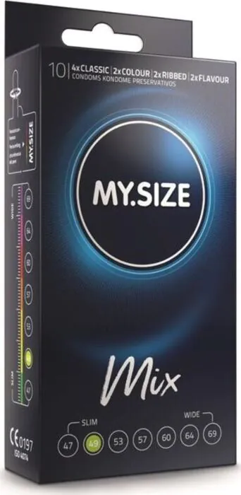 Erlebe Vielfalt mit den MY SIZE MIX Kondomen in 49 mm Breite. Hipoallergen, fast geruchlos und in 4 aufregenden Variationen erhältlich. Indicado für alle, die Wert auf Komfort legen.