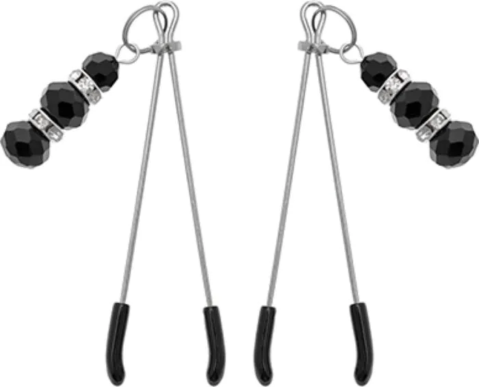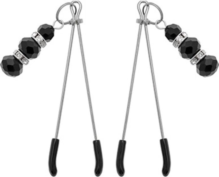 Die kleinen schwarzen Perlchen sind dekorativ und funktional: Durch Bewegungen und ihr Gewicht erzeugen sie zusätzliche Reize an den Brustwarzen, die die Wahrnehmung verstärken.