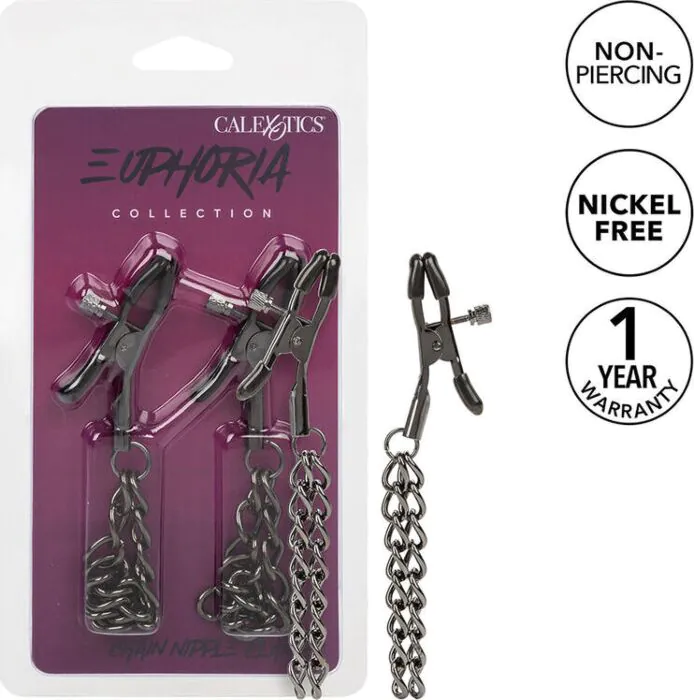 Intensive Stimulation der Brustwarzen mit individuell einstellbaren Pinzetten für ein maßgeschneidertes Vergnügen. Die Euphoria Pinzetten von CALEXOTICS bieten durch ihre weichen Polsterung einen angenehmen Halt, während die doppelte Kette die Empfindungen mit jedem bewegten Schritt verstärkt.