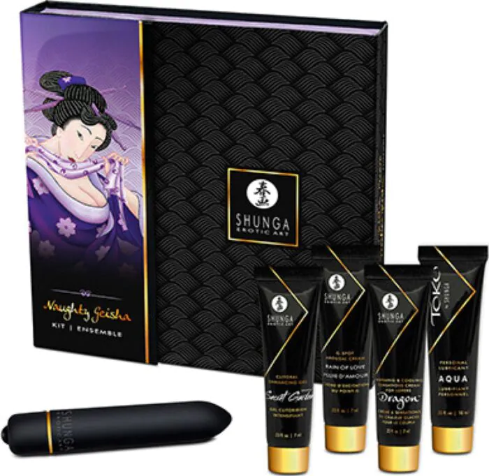 Erlebe intensive Sinnlichkeit mit dem SHUNGA Geisha Naughty Kit, das eine elegante Auswahl an Erotikprodukten bietet. Mit einem Wassergleitmittel von Toko, einem Klitorisgel und einer leistungsstarken vibrierenden Kugel mit 10 Geschwindigkeiten sind neue Empfindungen garantiert.