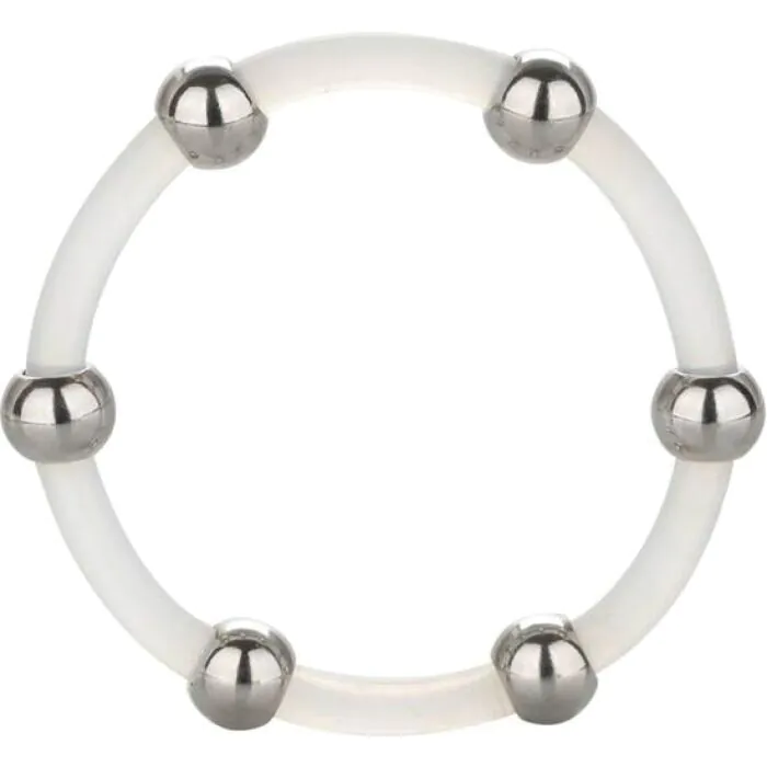 Erlebe eine verstärkte Empfindung und Ausdauer mit dem Anillo aus Silikon und Stahlperlen von CALEXOTICS. Dieser elastische Ring bietet nicht nur maximalen Komfort, sondern auch das aufregende Prickeln der Stahlperlen, die sowohl dich als auch deinen Partner begeistern. Das Material kombiniert hochwertige Silikonkonstruktion mit robusten, anregenden Perlen aus Edelstahl.