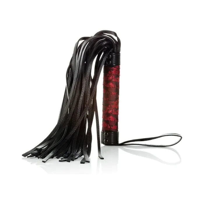 Lederpeitsche mit Griff mit einem schönen roten Stoff mit Blumendetails bedeckt Griff.