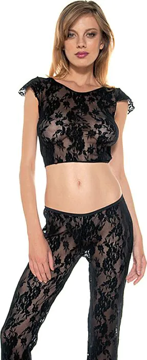 Zweiteiliges Set von Music Legs: Hose und kurzes Top aus schwarzer Spitze mit kleinen Ärmeln. Für dich, wenn du zarte, halbtransparente Dessous suchst, die Figur betonen ohne feste Korsettstruktur. Gut geeignet für besondere Abende und Fotoshootings; weniger geeignet, wenn du starke Unterstützung oder komplette Blickdichte brauchst.