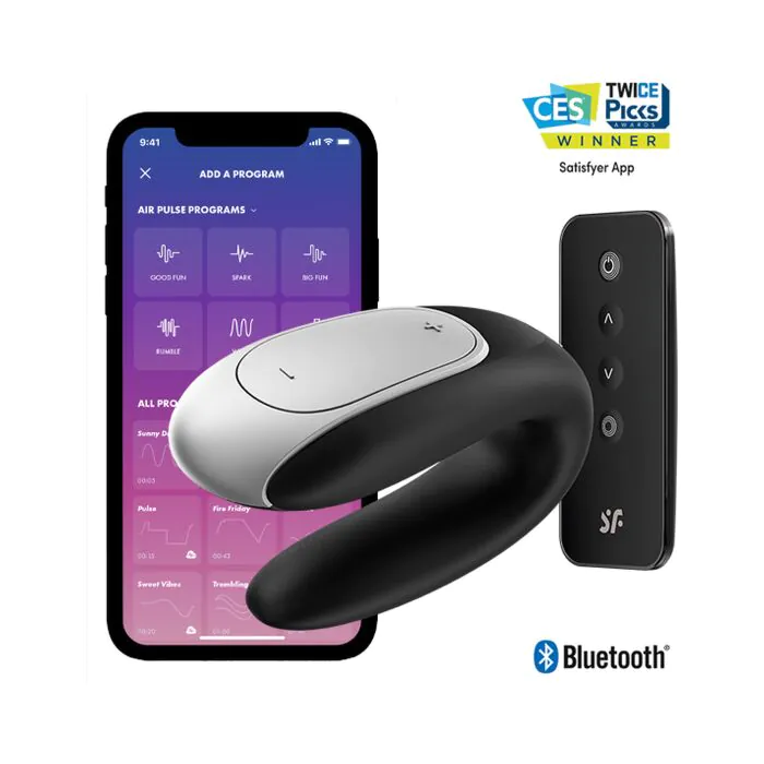 Er verfügt auch über eine intuitive Steuerung: Die verschiedenen Vibrationsprogramme können entweder über die Steuertasten des Paarvibrators selbst, die mitgelieferte drahtlose Fernbedienung oder über die Satisfyer Connect-App gesteuert werden.
